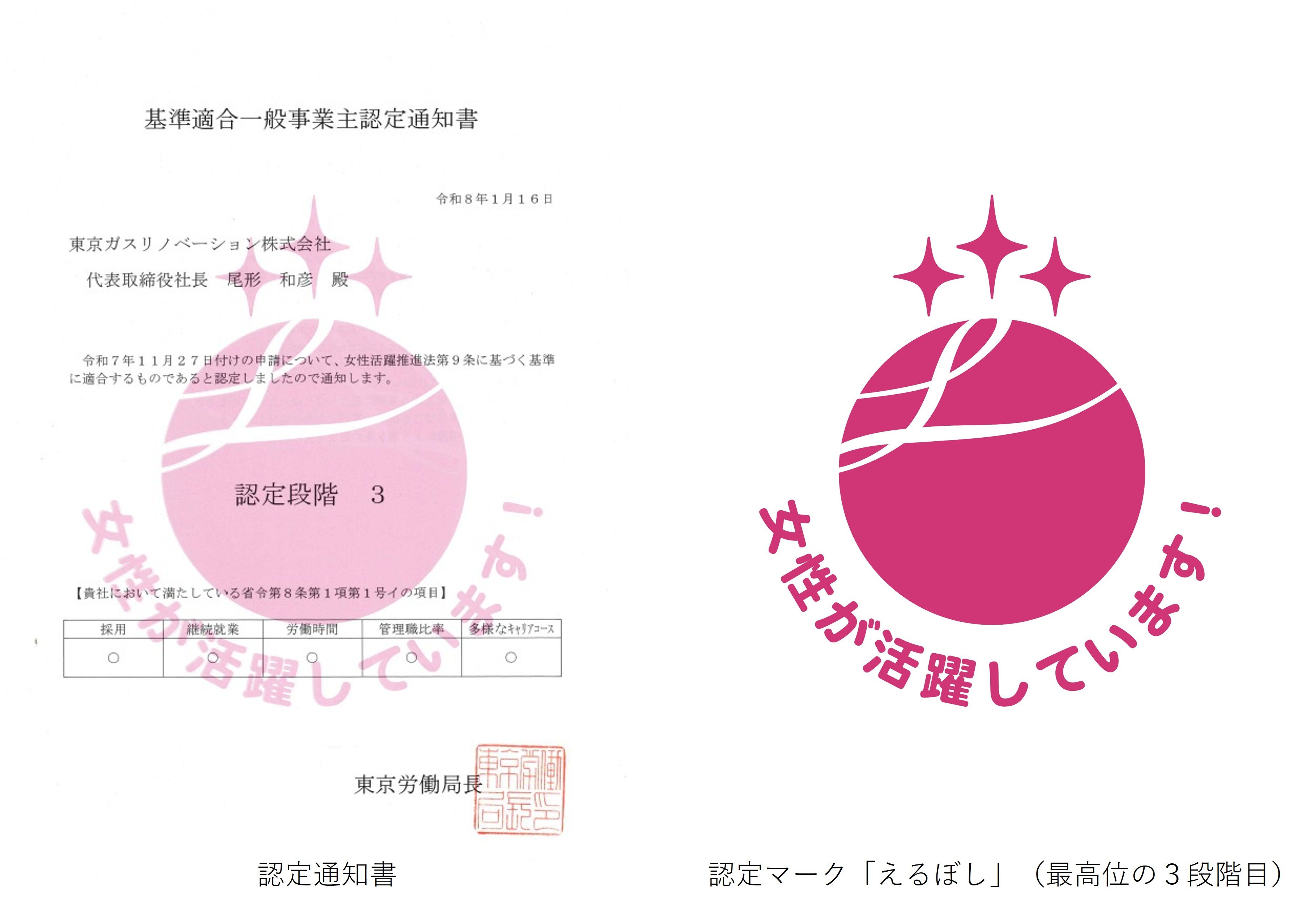 東京ガスリノベーション株式会社は、2026年1月16日に、女性活躍推進法に積極的に取り組む企業として、労働大臣が認定する「えるぼし」の、最高位である3段階目(3つ星)を取得しました。