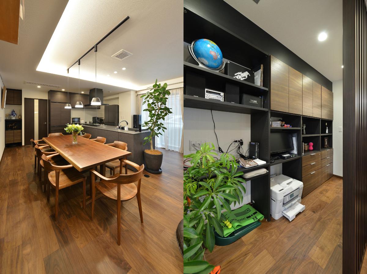 ウォルナットの美しい木肌が印象的なLDK。「新しい家族として犬を迎える予定なので、滑りにくい愛犬仕様の床材を選びました」とFさま。和室の間仕切りをオープンにすると大人数のゲストをお招きするホームパーティもよりゆったりと楽しめます。