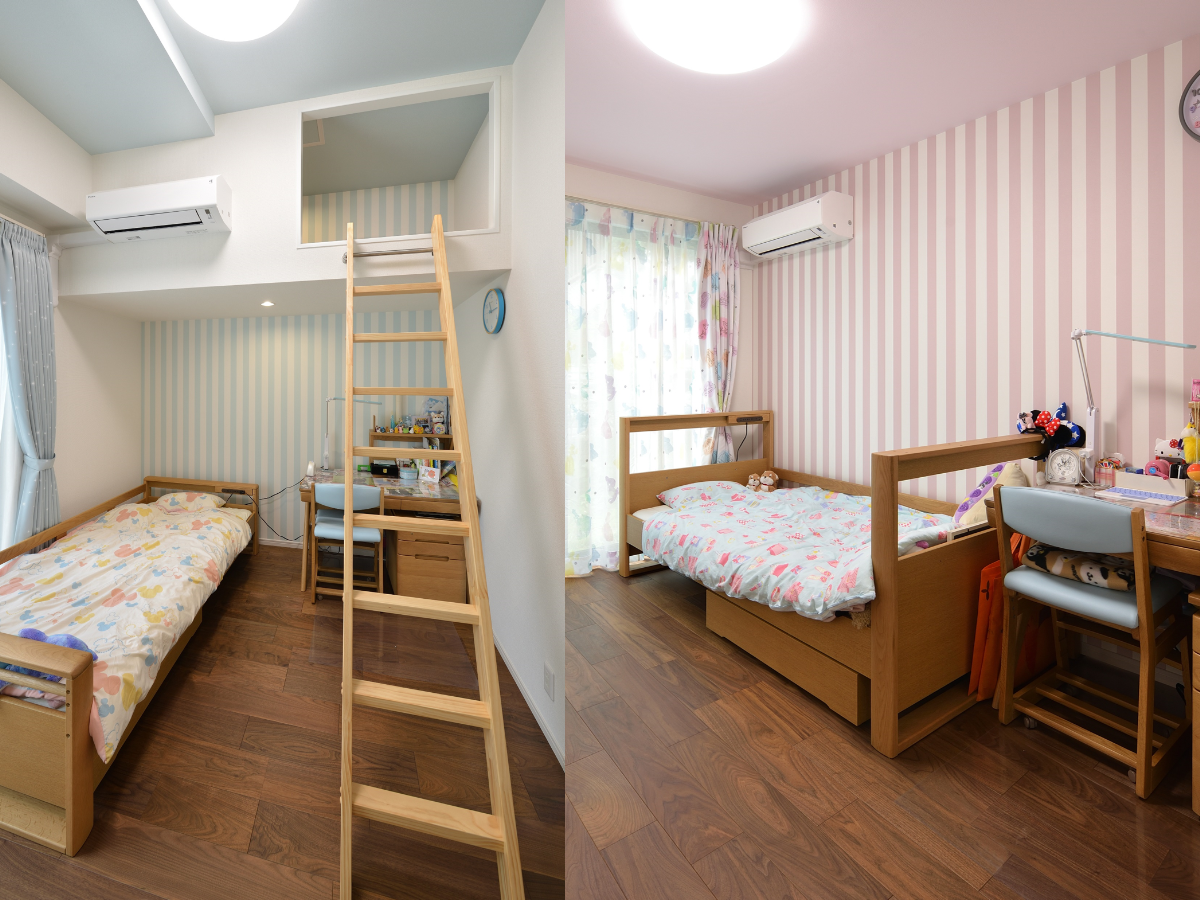 建物解体の際に、天井懐に十分なスペースがあることがわかり、ロフトを設けた遊び心満載の子供室。2人で一緒に使っていた子供室から、独立した個室に。内装や家具のレイアウトはお子さまと相談しながら、Fさまがセレクト