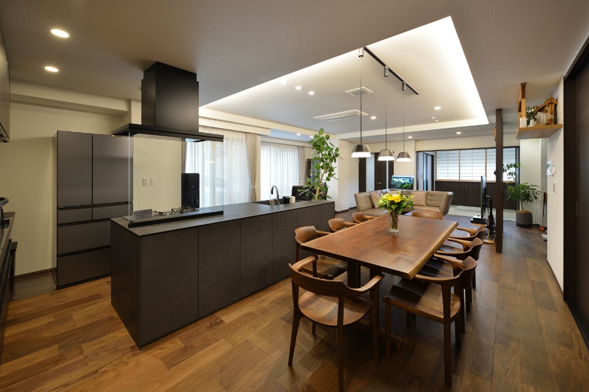 もともと来客の多い我が家でしたが、リノベーション後はより多くの人が遊びに来てくれるようになりました。新居に来て「ショールームみたい!」とみんな驚きます。ホテルライクな調光できる間接照明や、皆で使えるアイランドキッチン、20人以上が集まってもゆとりの大空間を楽しんでいます。心地よい照明のダイニングスペースには自然と家族が集まります。