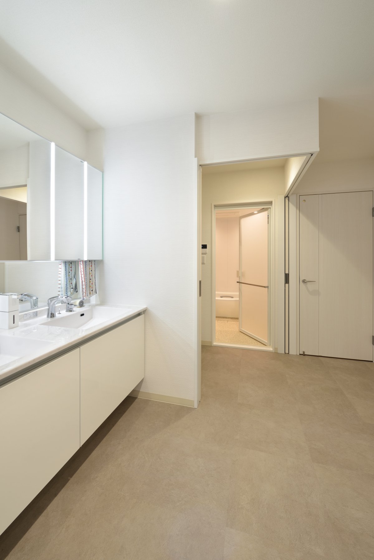 普段は1つの空間として使い、必要に応じて間仕切れる脱衣室。「朝の早い夫が、このスペースで洗顔・着替えなど身支度が完結するように、動線をイメージしながら考えました」とFさま 。洗面脱衣室の奥に設けた家事室は洗濯機・幹太くん、物干しスペースを集約したランドリースペースとなっています。