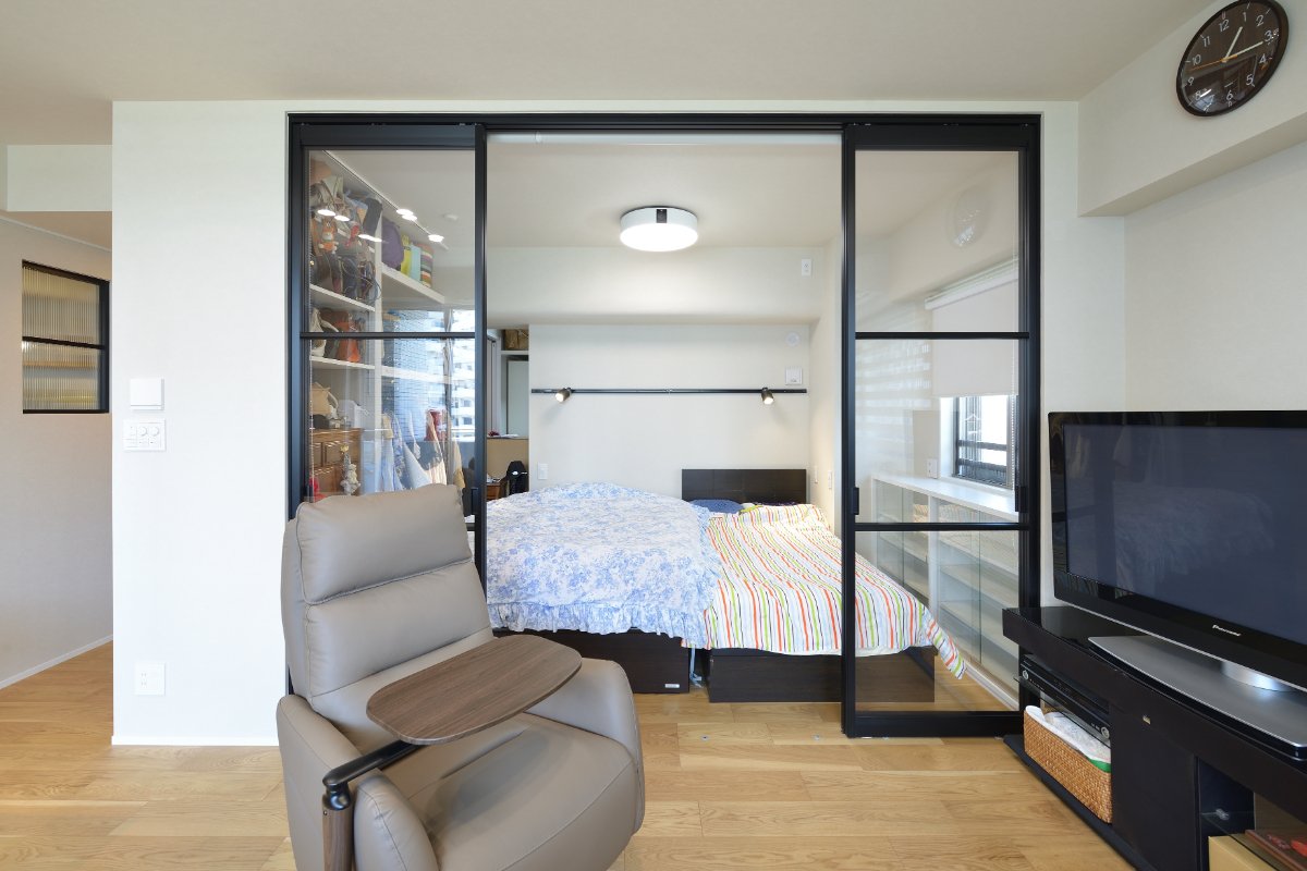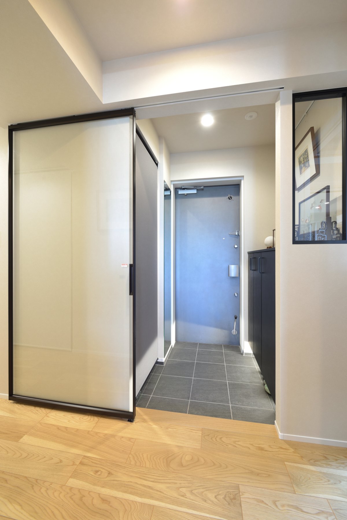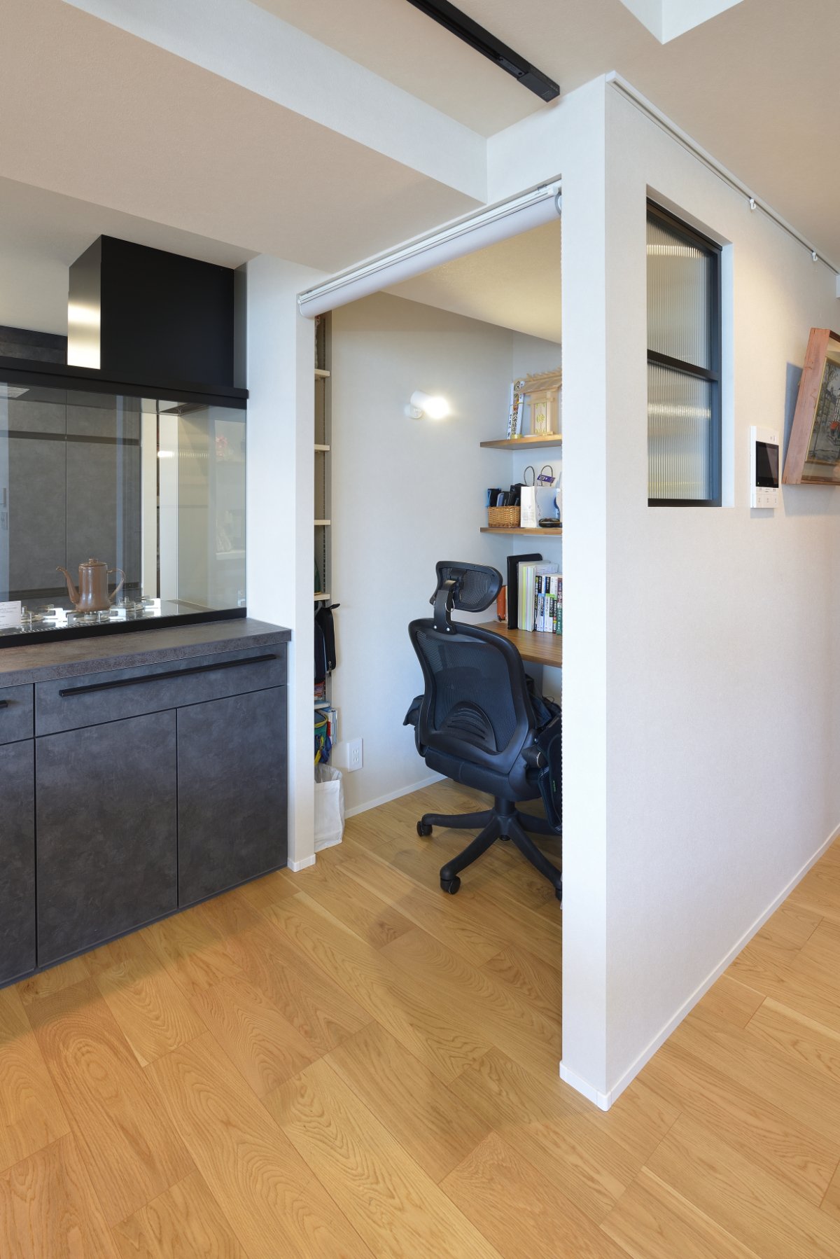 浴室、玄関の2重ドア、主寝室の引戸などに採用したガラス素材とアルミ素材を組み合わせたインストリアルなドアとの調和を考え、デスクコーナーやエントランスホールの袖壁にシャープな室内窓を設置することをご提案