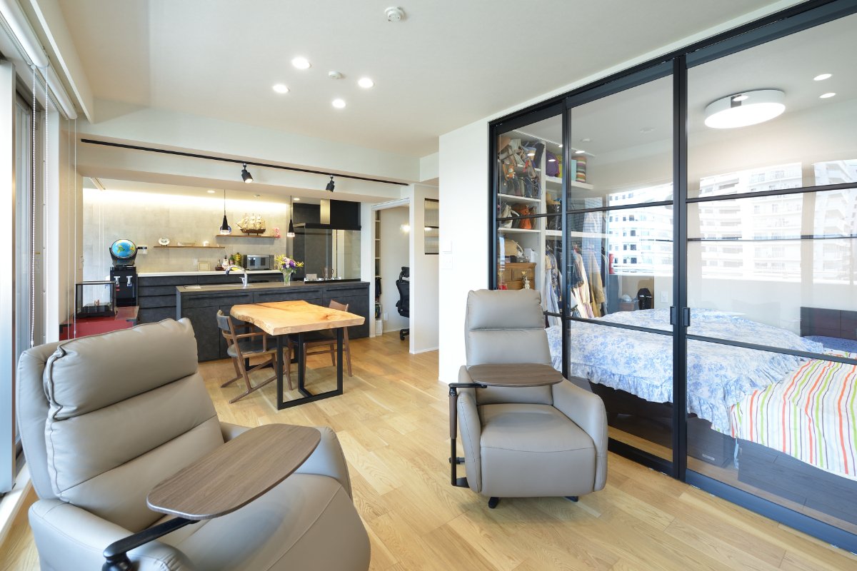 主寝室とリビングは必要に応じて一体でつかえるように計画。広々としたリビングの中に、小上がりスペース、デスクコーナーなど「個の時間」を楽しむスペースをご提案