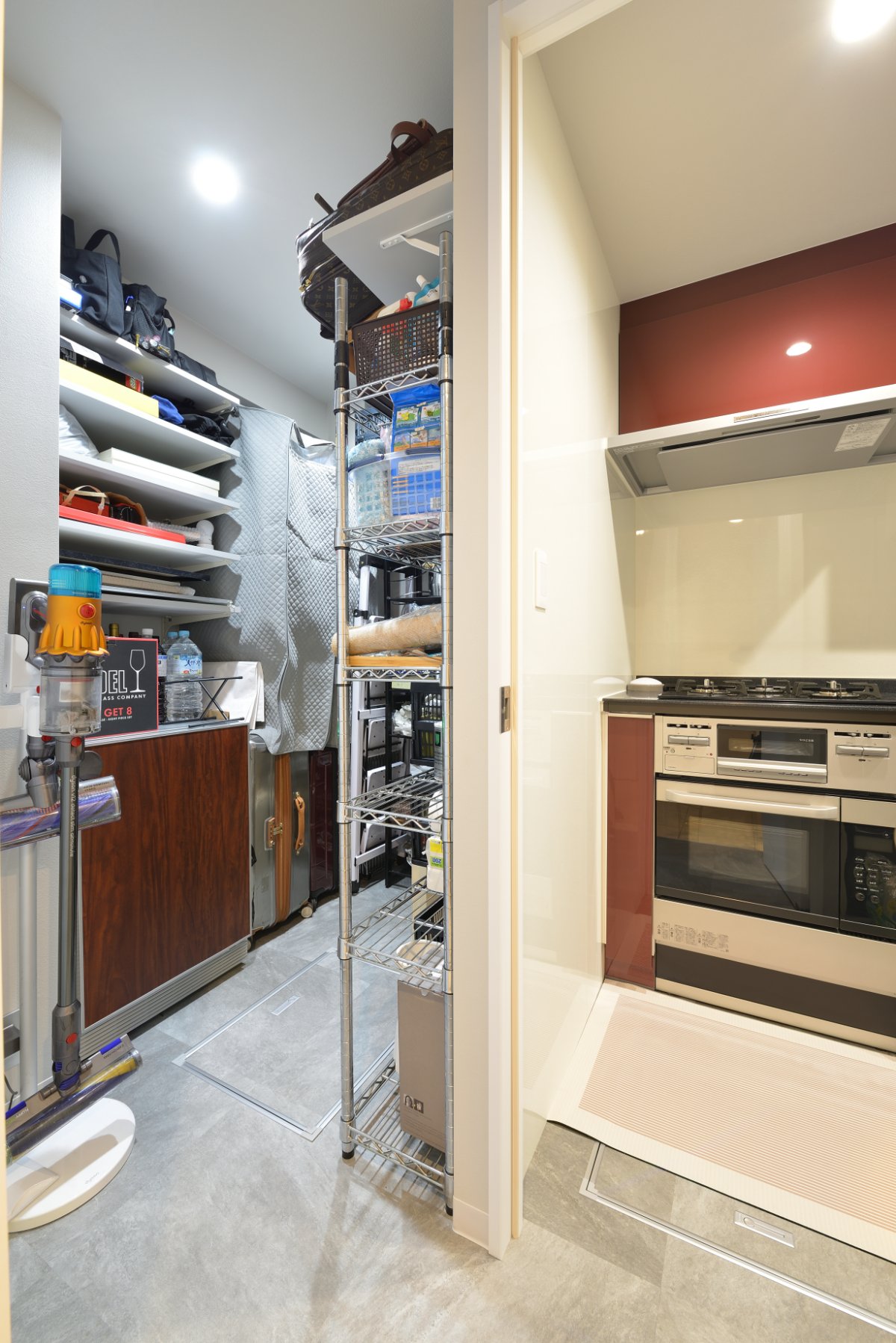 玄関から直接アクセスできて、キッチン、ダイニングに繋がる収納力のあるパントリーをご提案