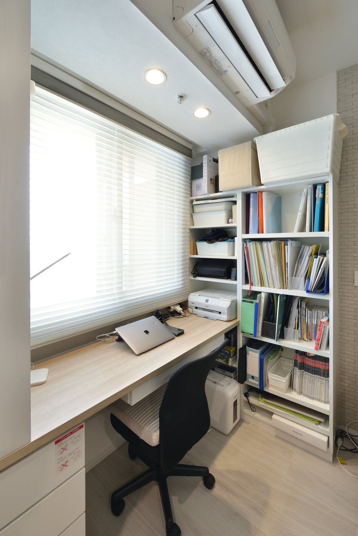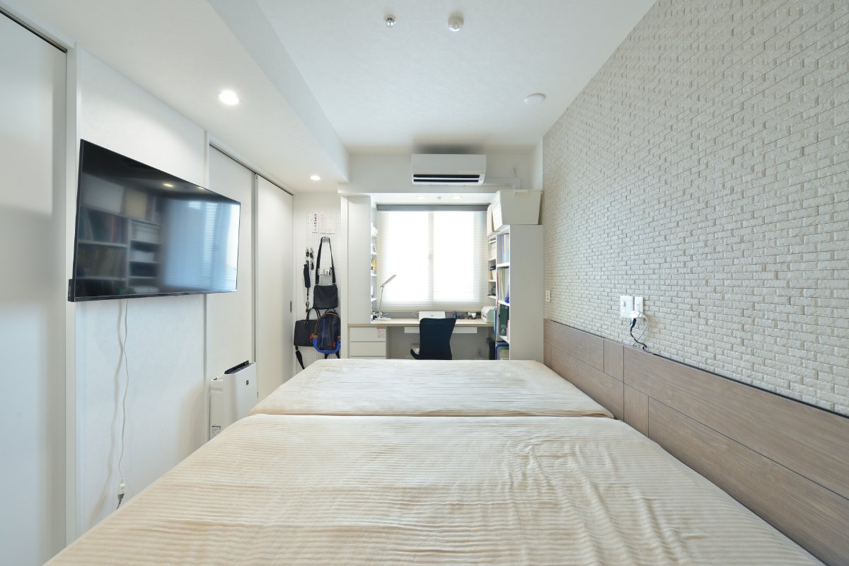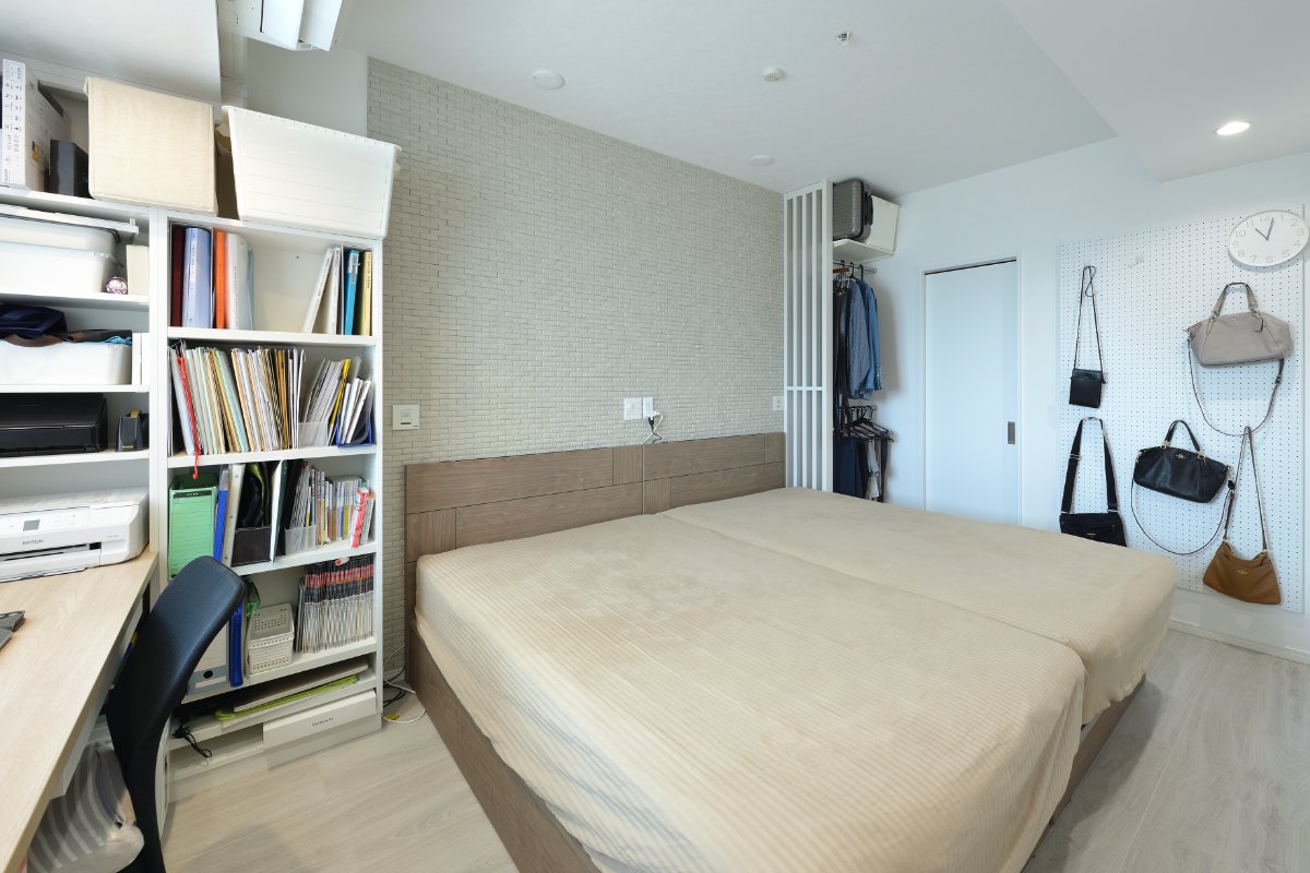 以前は子供室だった洋室を主寝室に。ベッドエンドを通り抜けられるように、リビングとの間仕切り壁の位置を移動。出入り口を2カ所設けて、キッチン側の引き戸は奥さまのベッドスペースに、窓側の引き戸はご主人さまのワークスペースに直行できるスタイルをご提案