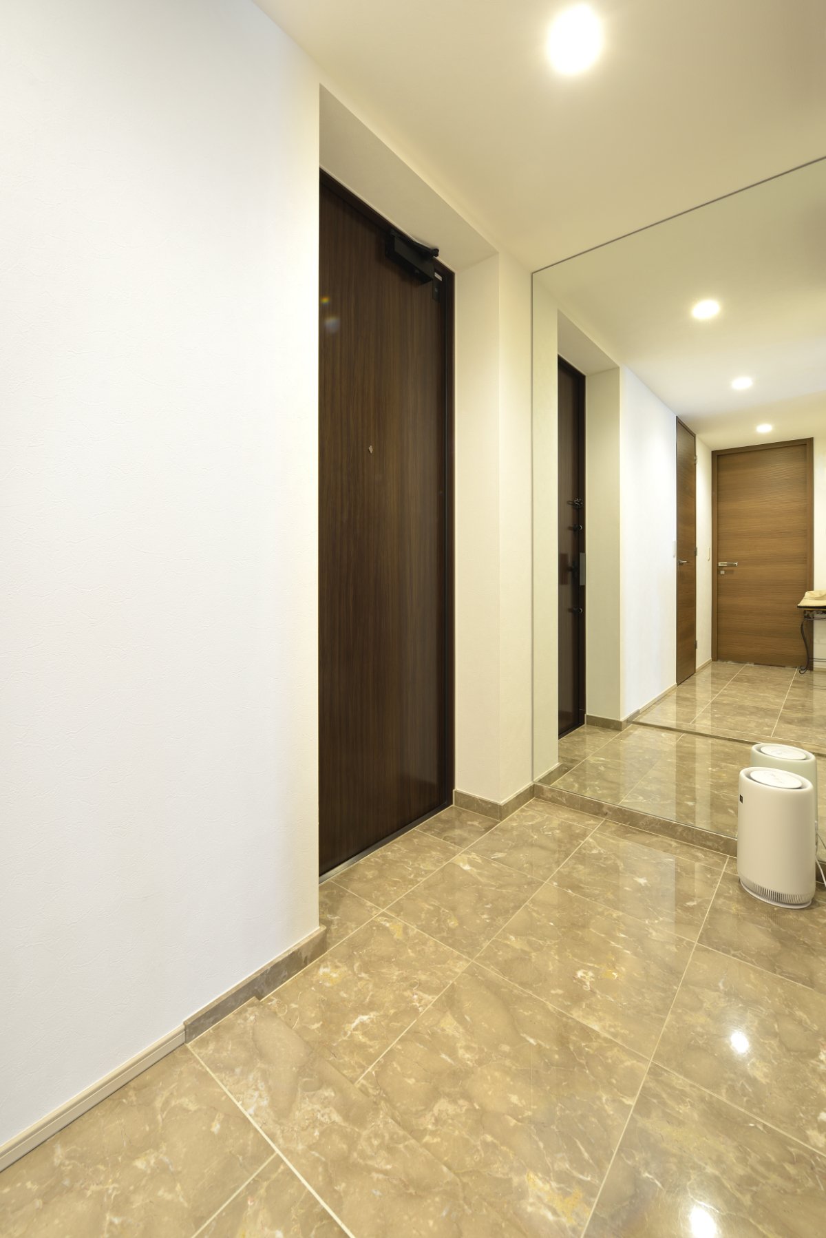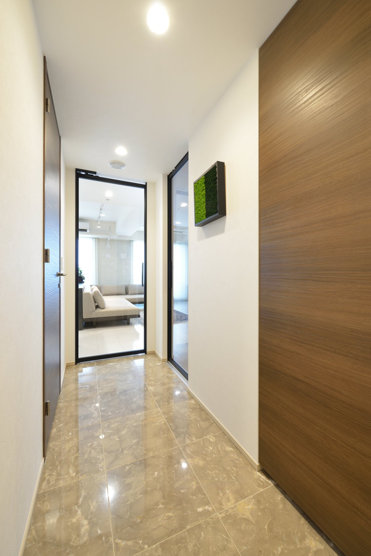 リビングダイニングへの出入り口は視覚的な広がりを感じるシャープなガラス扉をご提案