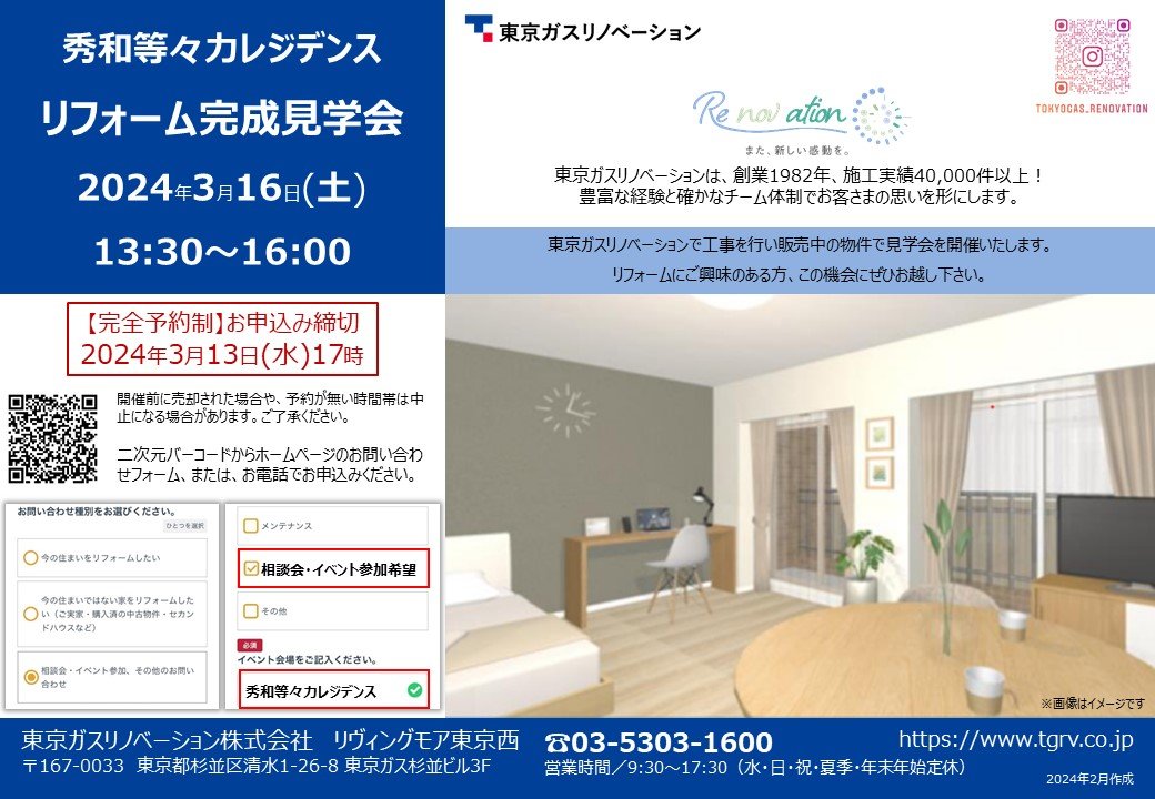 東京ガスリノベーションで工事を行い販売中の物件で見学会を開催いたします。