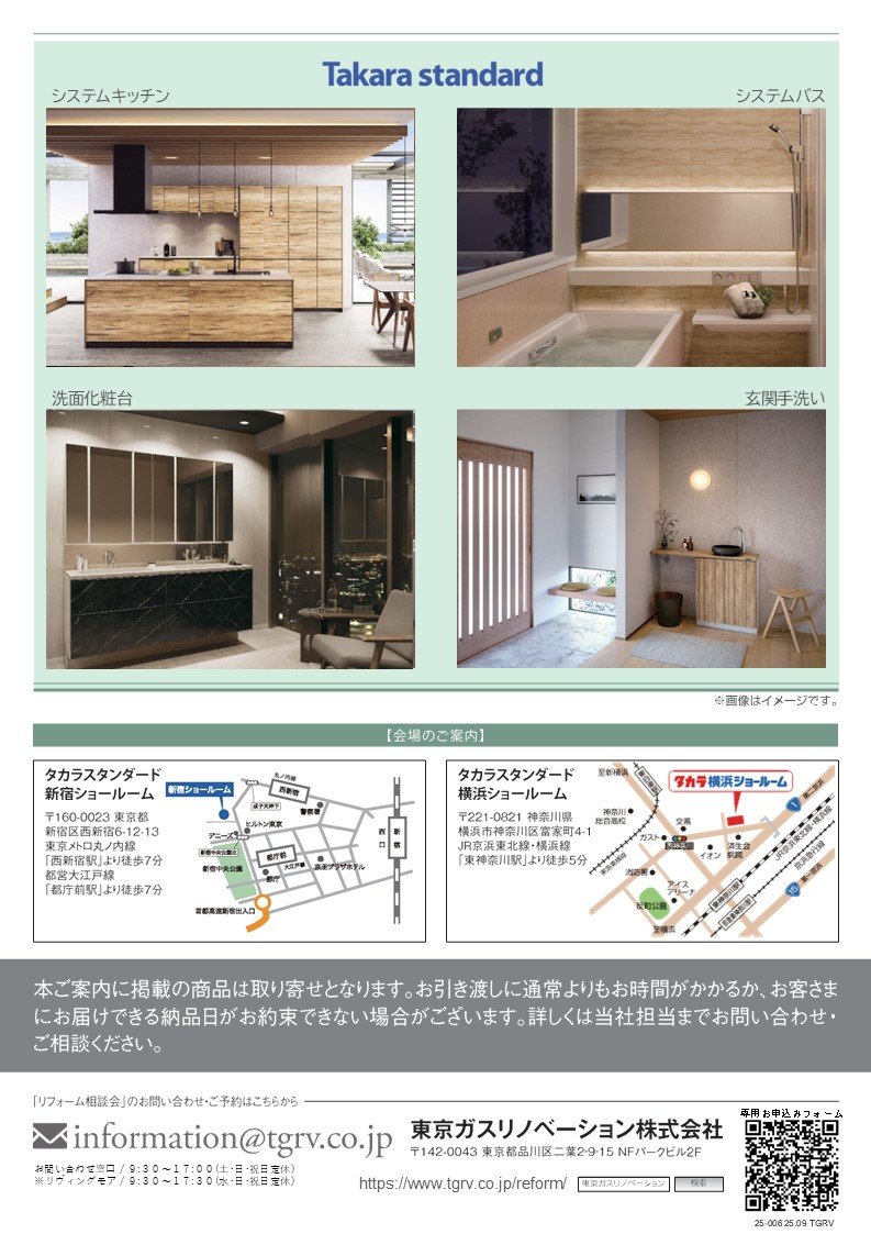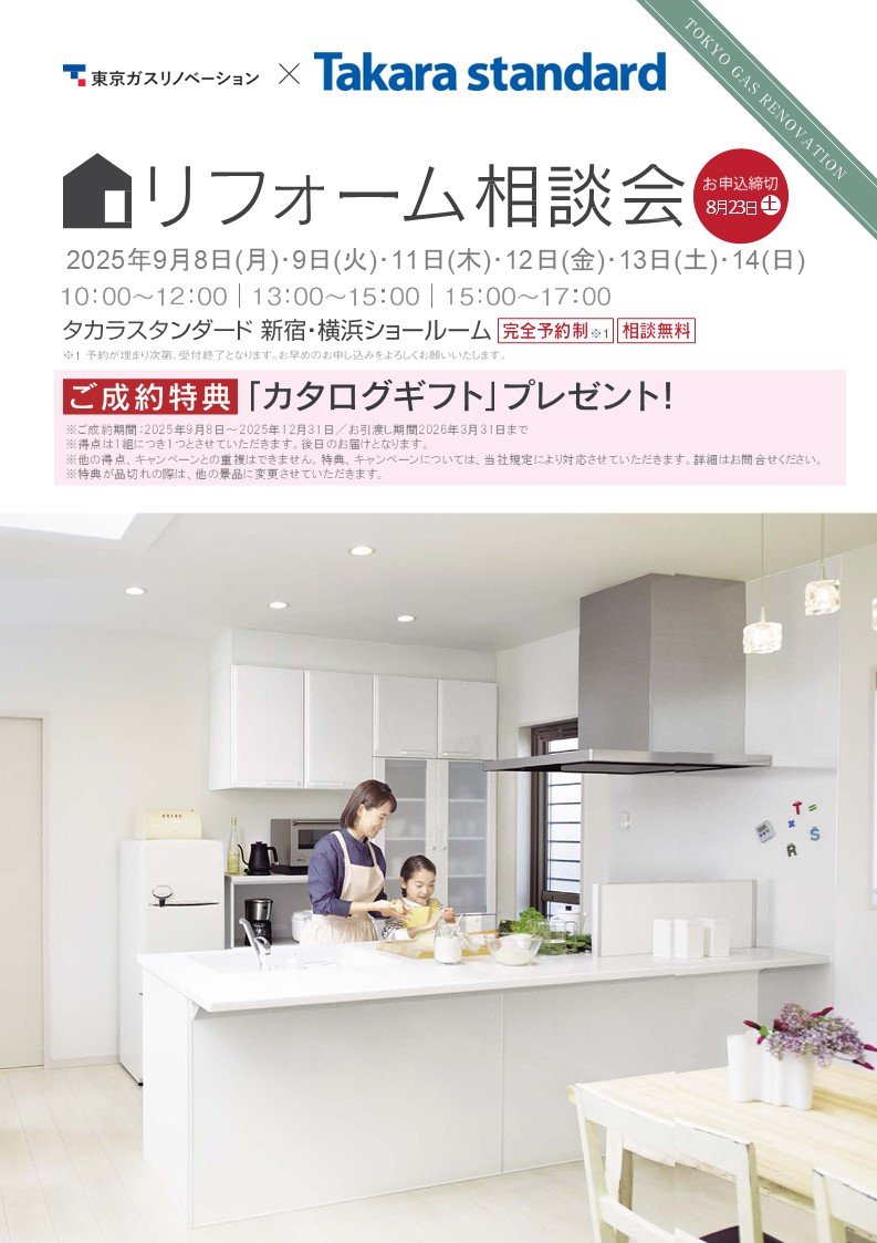 9月8日(月)・9日(火)・11日(木)・12日(金)・13日(土)・14日(日)タカラスタンダードショールーム(新宿・横浜)でリフォーム相談会を開催いたします。