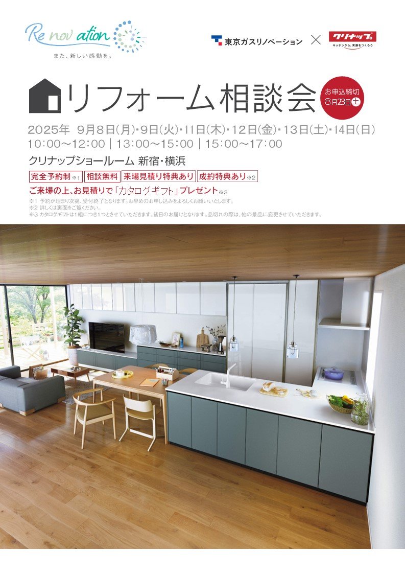 9月8日(月)・9日(火)・11日(木)・12日(金)・13日(土)・14日(日)クリナップ(新宿・横浜)でリフォーム相談会を開催いたします。