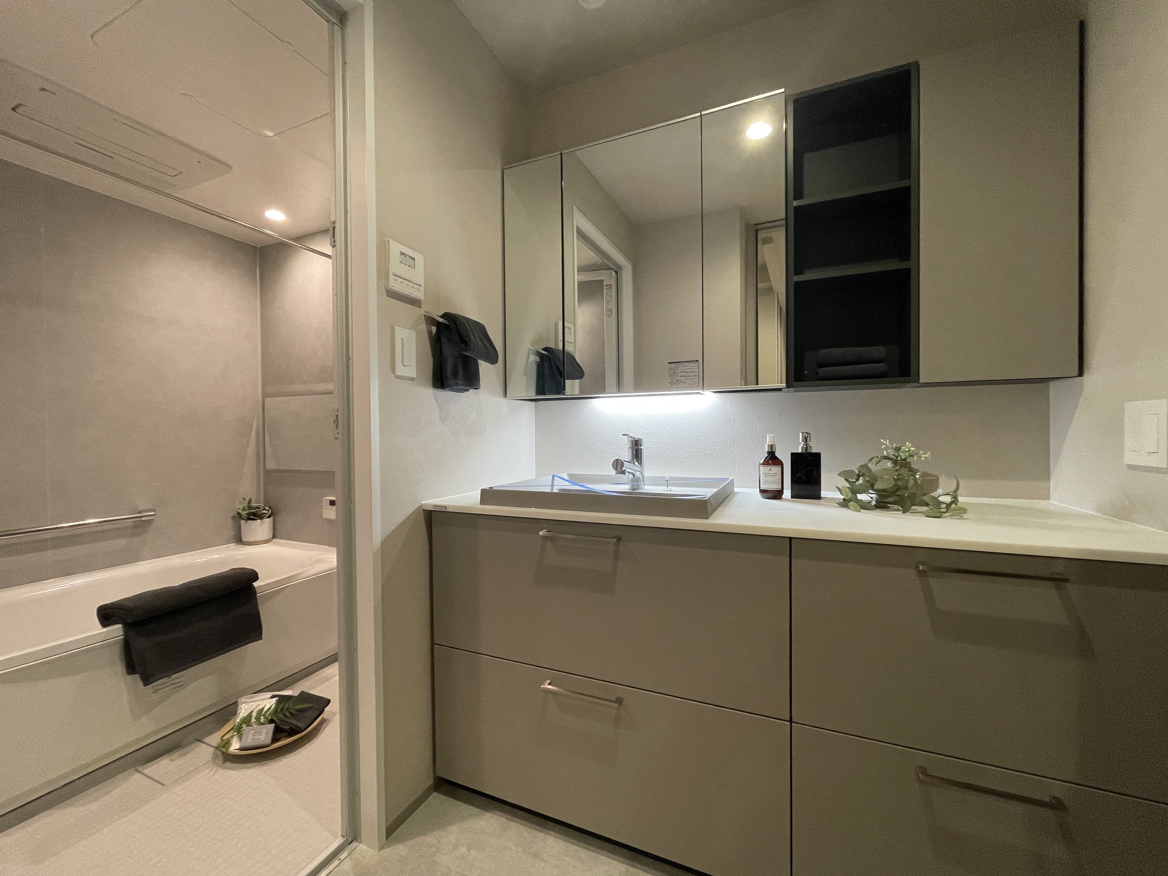 システムキッチン(ディスポーザー・食洗器有)/ユニットバス/洗面化粧台トイレ/フローリング/クロス/内部建具/床タイル/壁エコカラット(LDK)/ピクチャーレール(LDK)/床暖房/給湯器/カーテンレール(LDK、洋室1)/専有部給水給湯管/天井埋め込みエアコン(LDK)etc
