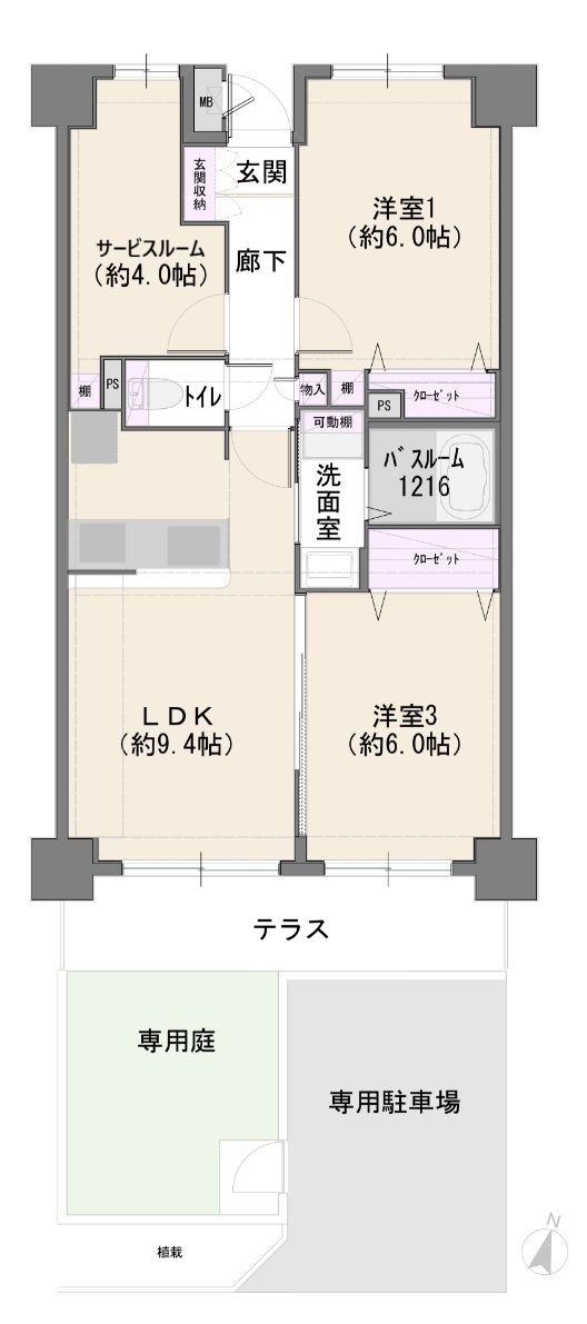 約8.96㎡の専用庭と専用駐車場(月額9,000円)付住戸! -
